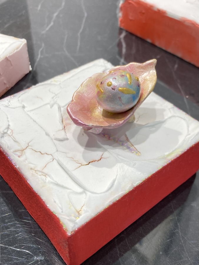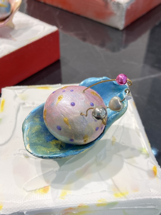 紙粘土のオブジェ、期待して待ちますあしたの玉子、何が産まれるやら考える楽しみ❣️会場で発表