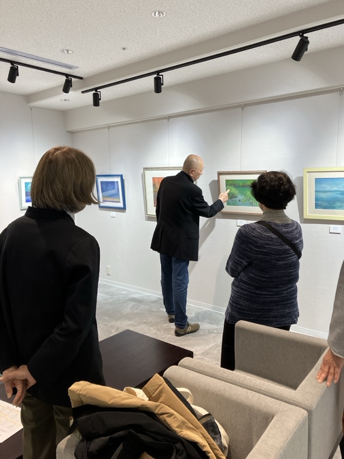 ガッシュ画会展の最終日に作品の総評をやります。一点一点いいところから始りあとちょっと風の色、少しの動きなどがあれば言うことなしで終わります。あとちょっとが難しいようです。