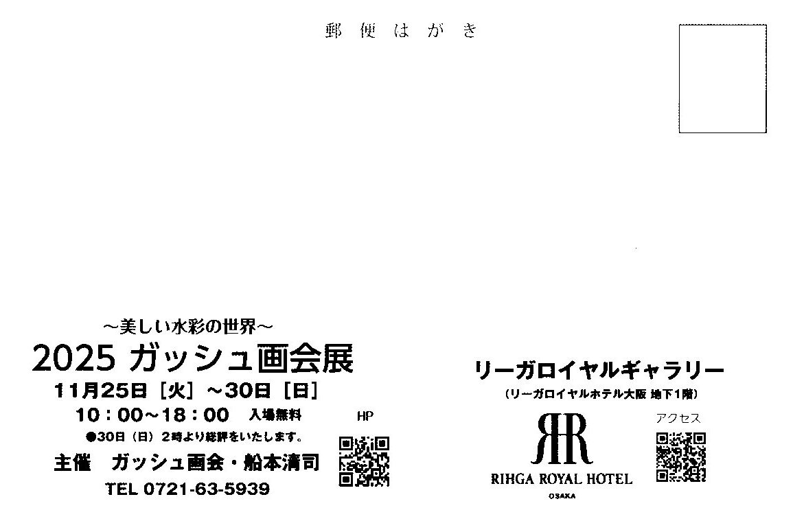 2025年は11月25日(火)~11月30日(日)の6日間、午前10時~午後6時、毎年開催しているガッシュ画を受講されている大阪・千葉・名古屋・神戸生徒さんの作品展です。