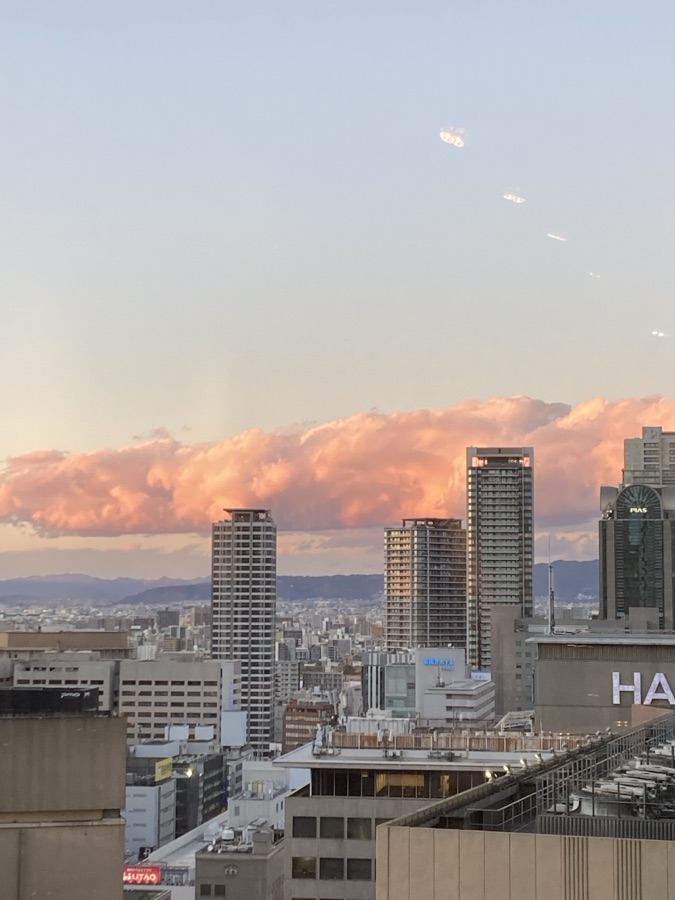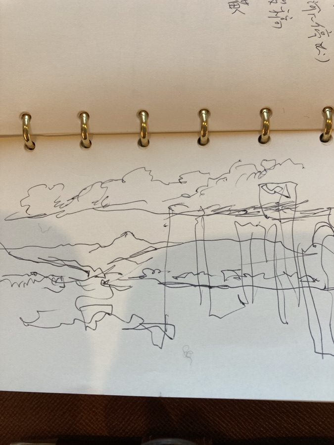 光る雲と光る山並と光る街並みのバランスがいい、おもわず手帳にスケッチする手前のビル群はじゃまだから輪郭だけ。