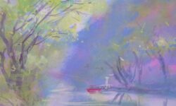 厚塗り台紙に、にじみを多用して優しい風の中の花達を描きました。
